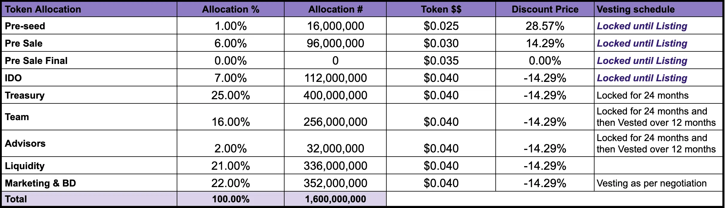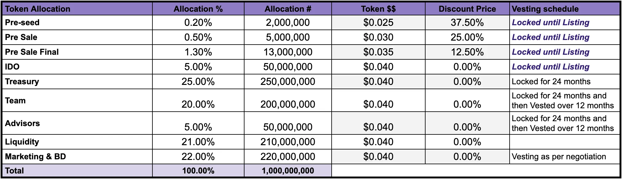 - Treasury tokens are locked for 24 months to ensure project sustainability.